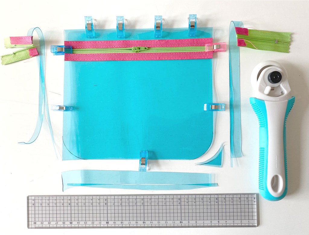 Reißverschluss (ca. 15 – 30 cm), Stoffclips, Stylefix, Garn (zum Schrägband passend) & halber Nähfuß / RV-Füßchen